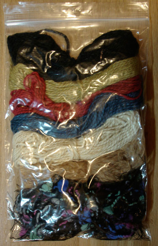 The Kumihimo Refill pack includes Hemp in all 5 colors (Black, Khaki, Red, Blue and Natural), some fancy/fun fur, and best of all, some hand-spun Alpaca from a local farm in North Bend, WA.
